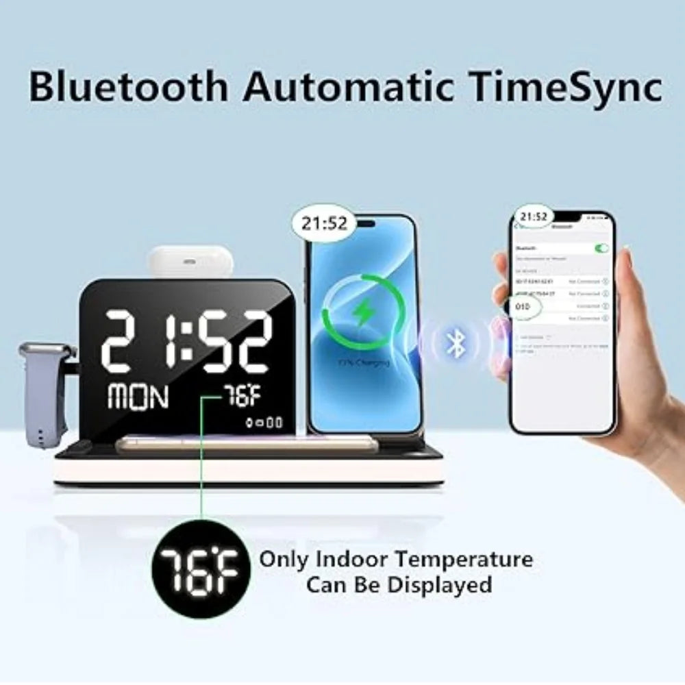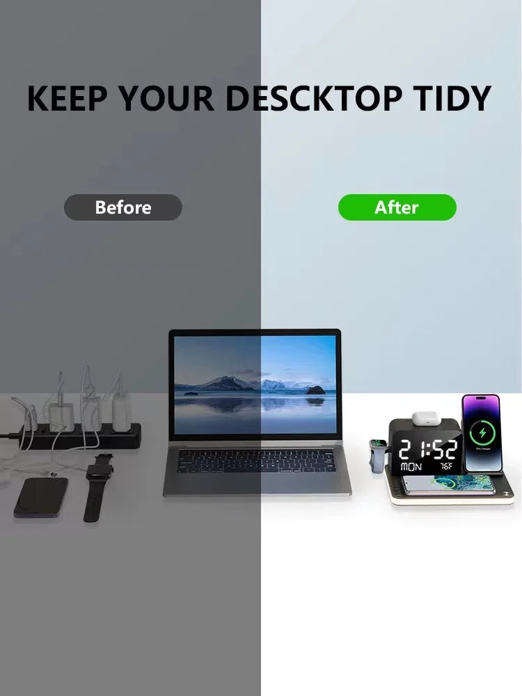 Charge all your Apple devices simultaneously with this innovative 7-in-1 wireless charging station. Featuring dual iPhone charging pads, Apple Watch stand, and additional device slots, it delivers fast wireless charging for iPhone 16, 15, 14 and compatible models. The integrated LED clock display keeps time visible while the ambient night lights create a soft glow perfect for bedside use. Sleek, space